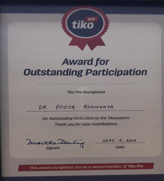 Award given by a NGO, for Tikko program.In it we do free antenatal checkups on every Wednesday.No consultation fees is charged.And discounts given on all investigations and procedures to patient who has Tiiko cards.